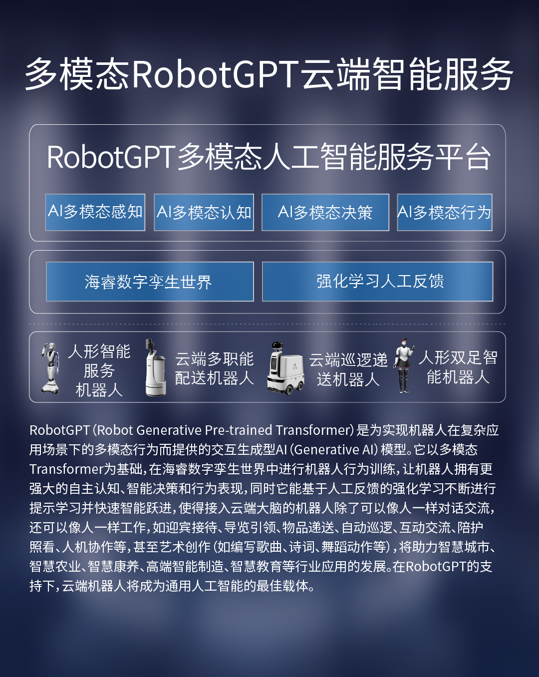 RobotGPT(Robot Generative Pre-trained Transformer)是为实现机器人在复杂应用场景下的多模态行为而提供的交互
